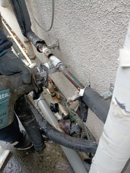 | 交換前の給湯器 | 交換前の台所リモコン | 交換前の浴室リモコン | 給湯器を外した写真 | 既存の配管を切断し、安全安心な架橋ポリエチレン管でやり替えます。 |
